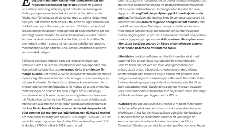 Mjuklandningen vi hoppas på kan få inflationen att öka mindre än lönerna så att vi får reallöneökningar utöver räntesänkningarna. Det stärker hela bostadsmarknaden. På bostadsrättssidan motverkas det av höjda räntekostnader i föreningar med bundna lån som läggs om där avgiftsökningar dyker upp likt hundbajs när snön smälter. På villasidan, där det inte finns föreningslån att ha koll på, kommer tvärt om oron för stigande energipriser att minska i takt med att värmen stiger. Det säljas många bostäder under våren, men tempot kan bli ryckigt när mäklare och kunder navigerar mellan långhelgerna. Vi på Erik Olsson räknar med att den positiva marknadspsykologin ger oss en aktiv marknad där styrkan visas i fler sålda bostäder snarare än högre priser eftersom dagens priser redan baseras på att räntorna sänks.