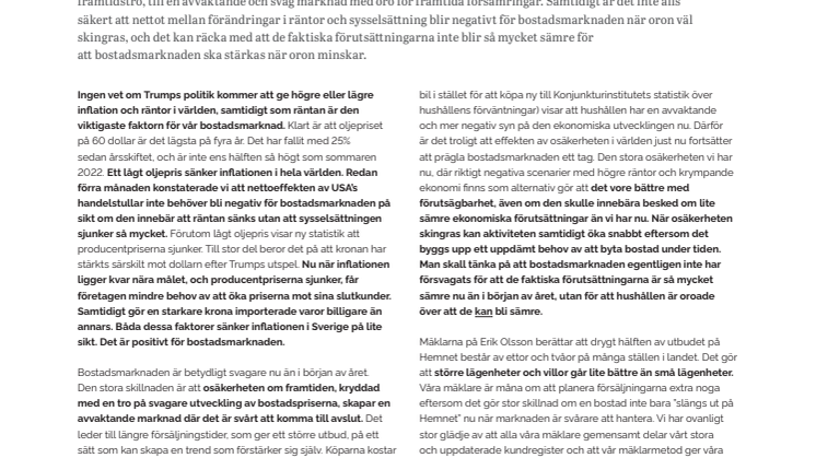 Ingen vet om Trumps politik kommer att ge högre eller lägre inflation och räntor i världen, samtidigt som räntan är den viktigaste faktorn för vår bostadsmarknad. Klart är att oljepriset på 60 dollar är det lägsta på fyra år. Det har fallit med 25% sedan årsskiftet, och är inte ens hälften så högt som sommaren 2022. Ett lågt oljepris sänker inflationen i hela världen. Redan förra månaden konstaterade vi att nettoeffekten av USA’s handelstullar inte behöver bli negativ för bostadsmarknaden på sikt om den innebär att räntan sänks utan att sysselsättningen sjunker så mycket. Förutom lågt oljepris visar ny statistik att producentpriserna sjunker. Till stor del beror det på att kronan har stärkts särskilt mot dollarn efter Trumps utspel. Nu när inflationen ligger kvar nära målet, och producentpriserna sjunker, får företagen mindre behov av att öka priserna mot sina slutkunder. Samtidigt gör en starkare krona importerade varor billigare än annars. Båda dessa faktorer sänker inflationen i Sverige på lite sikt. Det är positivt för bostadsmarknaden.