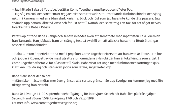 Nu släpps en ny låt i projektet Come Together. Baba Gurston, en musiker som trotsar sitt funktionshinder, bjuder på svängig reggae med ett budskap om att alla människor ska få samma möjligheter.