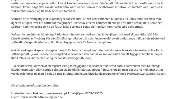 – Verksamheten Solrosen är en mycket viktig förebyggande verksamhet för dessa barn. I samverkan med Göteborgs Räddningsmission vill vi sprida Solrosen vidare till fler platser. Stödet från Länsförsäkringar ger oss nu möjlighet att utveckla och finnas på plats i Borås, säger Birgitta Johansson, biträdande programchef med Sverigeansvar på Erikshjälpen.