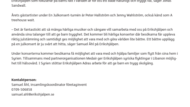– Det är fantastiskt att så många härliga musiker och sångare vill samarbeta med oss på Erikshjälpen och använda sina talanger till att ge barn trygghet. Det kommer bli härliga konserter där besökarna får uppleva riktig julstämning och samtidigt ges möjlighet att vara med och göra världen lite bättre. Ett bättre upplägg på en julkonsert är ju svårt att hitta, säger Samuel Åhl på Erikshjälpen.