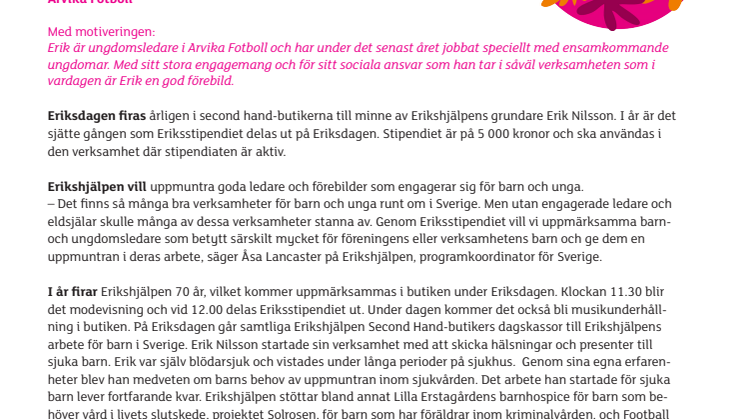 – Det finns så många bra verksamheter för barn och unga runt om i Sverige. Men utan engagerade ledare och eldsjälar skulle många av dessa verksamheter stanna av. Genom Eriksstipendiet vill vi uppmärksamma barn- och ungdomsledare som betytt särskilt mycket för föreningens eller verksamhetens barn och ge dem en uppmuntran i deras arbete, säger Åsa Lancaster på Erikshjälpen, programkoordinator för Sverige.