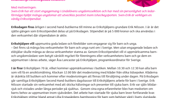 Erikshjälpen Second Hand i Lindesberg delar klockan 13.00 ut Eriksstipendiet till: