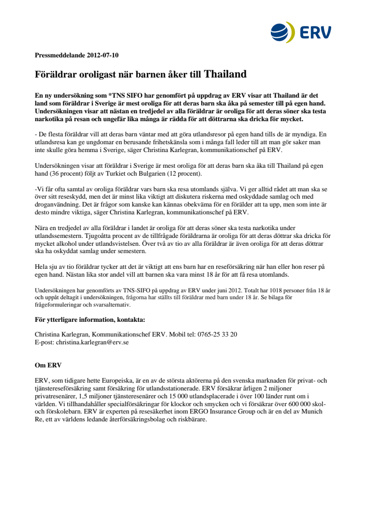 En ny undersökning som *TNS SIFO har genomfört på uppdrag av ERV visar att Thailand är det land som föräldrar i Sverige är mest oroliga för att deras barn ska åka på semester till på egen hand. Undersökningen visar att nästan en tredjedel av alla föräldrar är oroliga för att deras söner ska testa narkotika på resan och ungefär lika många är rädda för att döttrarna ska dricka för mycket.