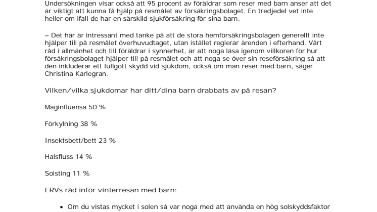En undersökning som utförts av TNS-SIFO* på uppdrag av försäkringsbolaget ERV visar att den vanligaste sjukdomen för barn på semestern är maginfluensa. Hälften av alla föräldrar som reser med barn uppger att barnen på någon semester har drabbats av sjukdomen. Mer förvånande är att elva procent av barnen någon gång har drabbats av solsting på semestern.