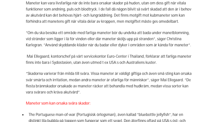 Mai Ellegaard, kontorschef på vårt servicekontor Euro-Center i Thailand, förklarar att farliga maneter finns inte bara i Sydostasien, utan även utmed t ex USA:s och Australiens kuster.