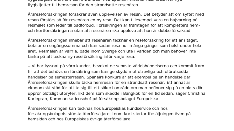 – Vi har lyssnat på våra kunder, bevakat de senaste världshändelserna och kommit fram till att det behövs en försäkring som kan ge skydd mot otrevliga och oförutsedda händelser på semesterresan. Spanairs konkurs är ett exempel på en händelse där Årsreseförsäkringen skulle täcka hemresan för en strandsatt resenär. Ett annat är ekonomiskt stöd för att ta sig till ett säkert område om man befinner sig på en plats där uppror plötsligt utbryter, likt dem som skedde i Bangkok för en tid sedan, säger Christina Karlegran, Kommunikationschef på försäkringsbolaget Europeiska.
