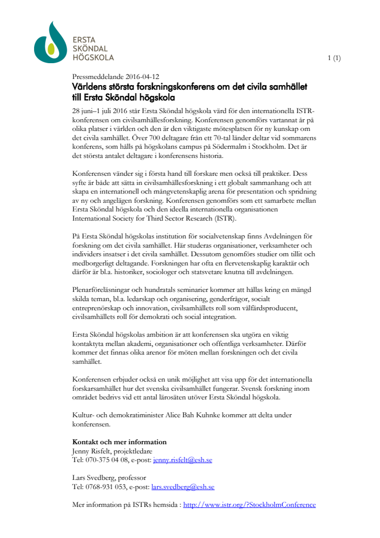 28 juni–1 juli 2016 står Ersta Sköndal högskola värd för den internationella ISTR-konferensen om civilsamhällesforskning. Konferensen genomförs vartannat år på olika platser i världen och den är den viktigaste mötesplatsen för ny kunskap om det civila samhället. Över 700 deltagare från ett 70-tal länder deltar vid sommarens konferens. Det är det största antalet deltagare i konferensens historia.
