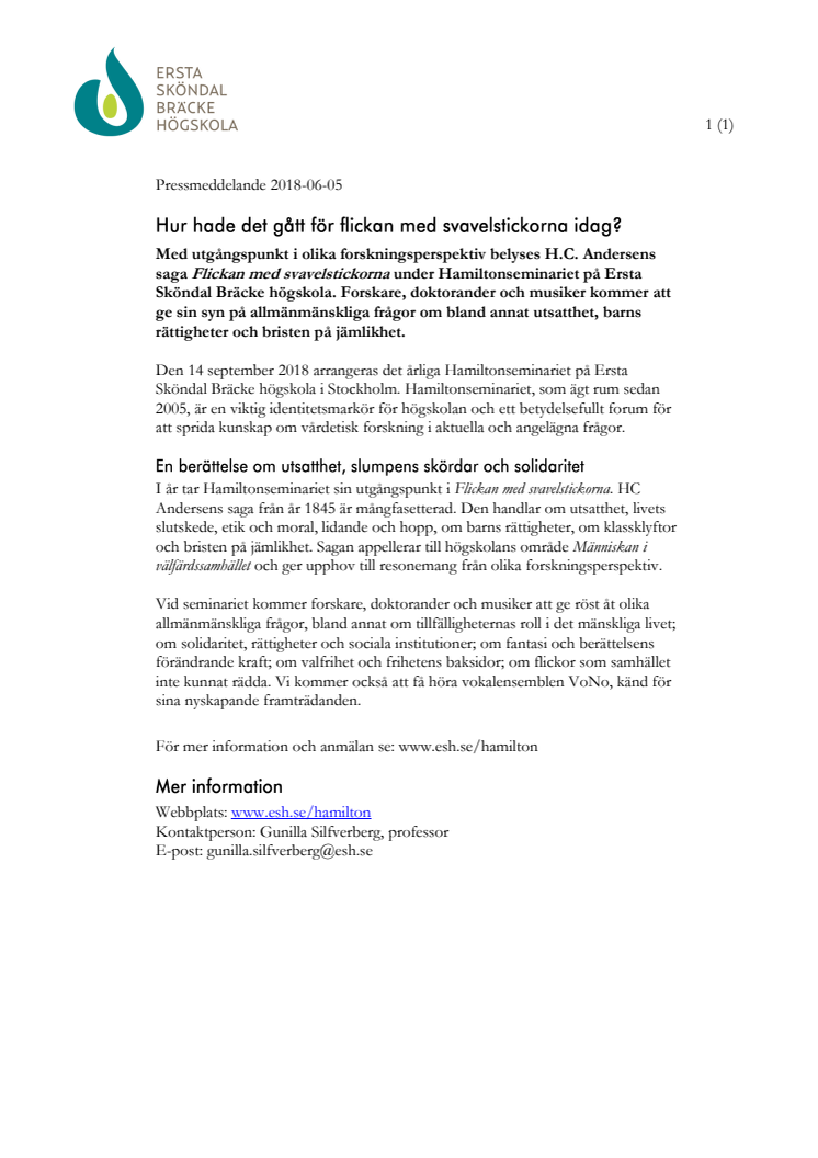 Med utgångspunkt i olika forskningsperspektiv belyses H.C. Andersens saga Flickan med svavelstickorna under Hamiltonseminariet på Ersta Sköndal Bräcke högskola. Forskare, doktorander och musiker kommer att ge sin syn på allmänmänskliga frågor om bland annat utsatthet, barns rättigheter och bristen på jämlikhet.