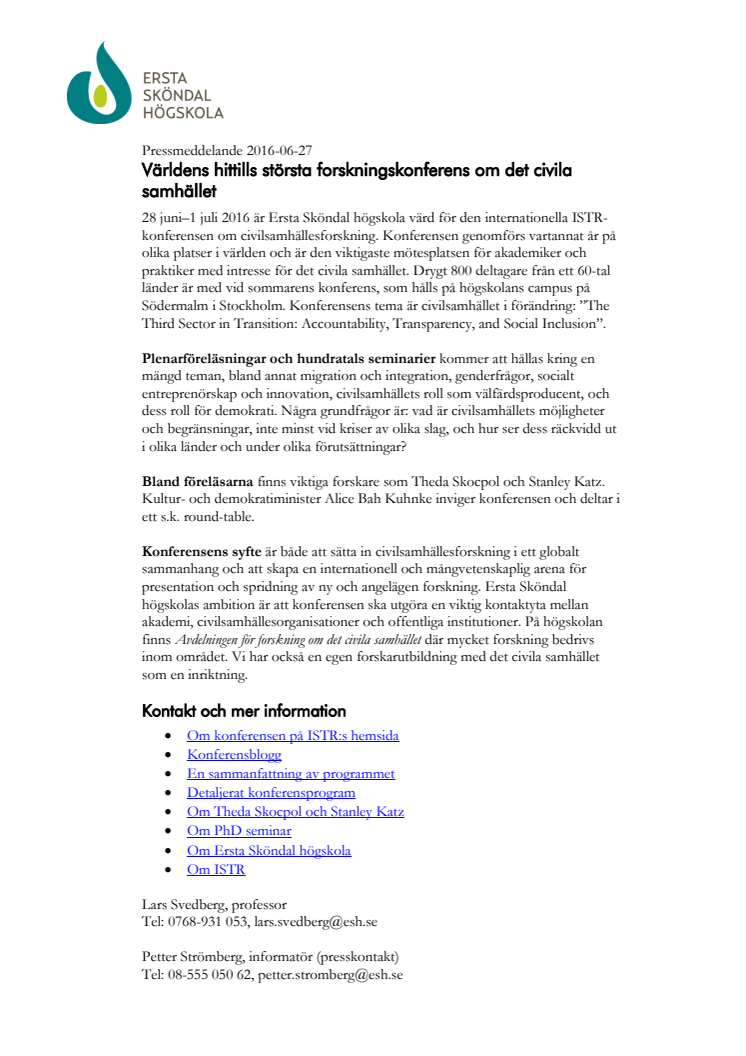 28 juni–1 juli 2016 är Ersta Sköndal högskola värd för den internationella ISTR-konferensen om civilsamhällesforskning. Konferensen genomförs vartannat år på olika platser i världen och är den viktigaste mötesplatsen för akademiker och praktiker med intresse för det civila samhället. Drygt 800 deltagare från ett 60-tal länder är med vid sommarens konferens, som hålls på högskolans campus på Södermalm i Stockholm. Konferensens tema är civilsamhället i förändring: ”The Third Sector in Transition: Accountability, Transparency, and Social Inclusion”.