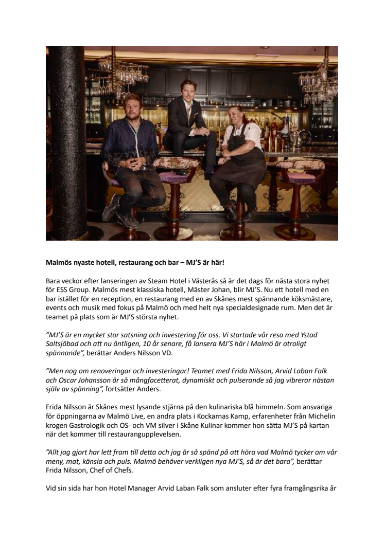 Bara veckor efter lanseringen av Steam Hotel i Västerås så är det dags för nästa stora nyhet för ESS Group. Malmös mest klassiska hotell, Mäster Johan, blir MJ’S. Ett hotell med en bar istället för en reception, en restaurang med en av Skånes mest spännande köksmästare, events och musik med fokus på Malmö och med helt nya specialdesignade rum. Men det är teamet på plats som är MJ’S största nyhet.