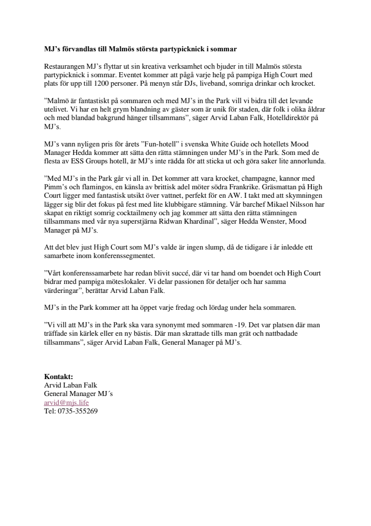 Restaurangen MJ’s flyttar ut sin kreativa verksamhet och bjuder in till Malmös största partypicknick i sommar. Eventet kommer att pågå varje helg på pampiga High Court med plats för upp till 1200 personer. På menyn står DJs, liveband, somriga drinkar och krocket.