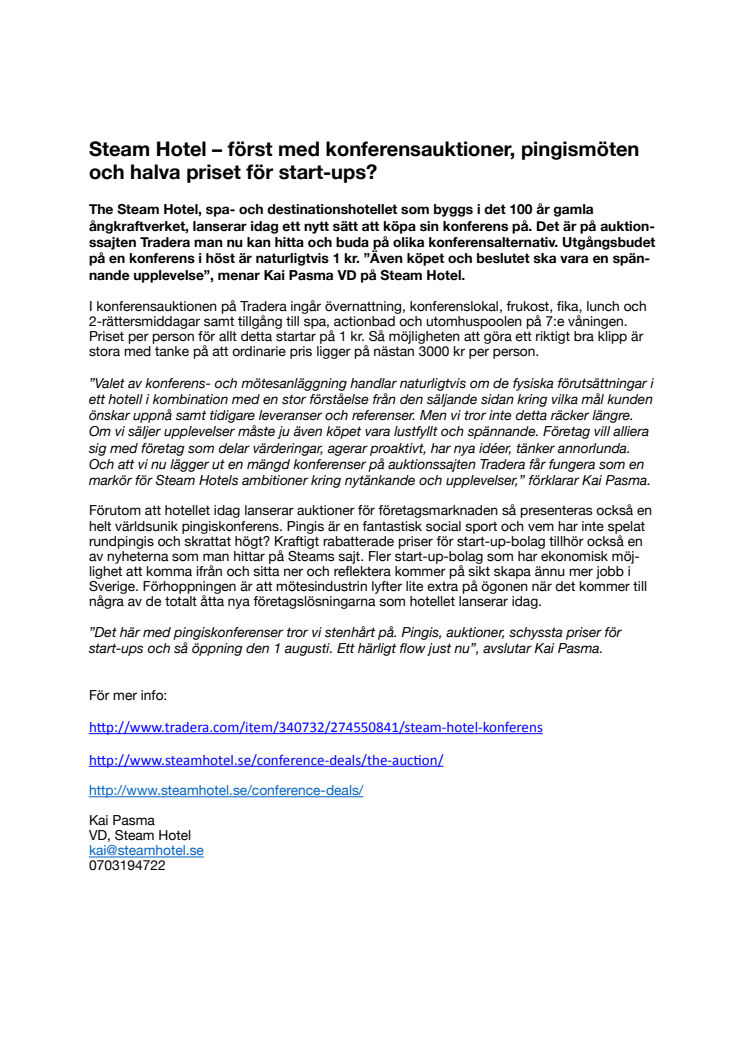 The Steam Hotel, spa- och destinationshotellet som byggs i det 100 år gamla ångkraftverket, lanserar idag ett nytt sätt att köpa sin konferens på. Det är på auktionssajten Tradera man nu kan hitta och buda på olika konferensalternativ. Utgångsbudet på en konferens i höst är naturligtvis 1 kr. ”Även köpet och beslutet ska vara en spännande upplevelse”, menar Kai Pasma VD på Steam Hotel.