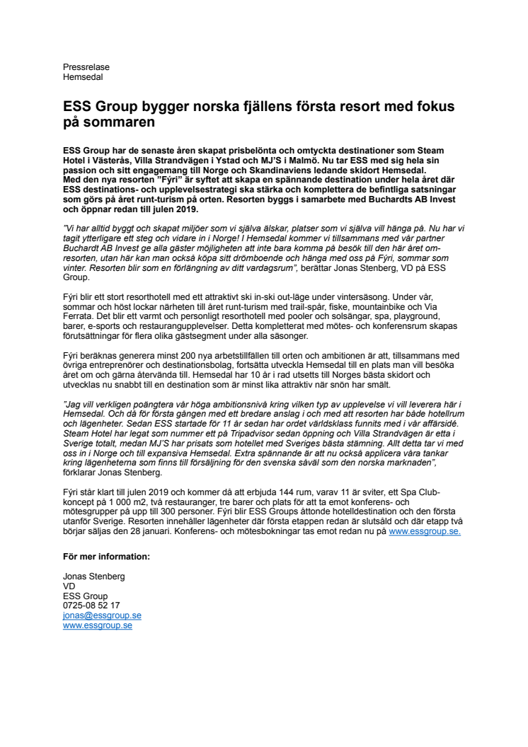 ”Jag vill verkligen poängtera vår höga ambitionsnivå kring vilken typ av upplevelse vi vill leverera här i Hemsedal. Och då för första gången med ett bredare anslag i och med att resorten har både hotellrum och lägenheter. Sedan ESS startade för 11 år sedan har ordet världsklass funnits med i vår affärsidé. Steam Hotel har legat som nummer ett på Tripadvisor sedan öppning och Villa Strandvägen är etta i Sverige totalt, medan MJ’S har prisats som hotellet med Sveriges bästa stämning. Allt detta tar vi med oss in i Norge och till expansiva Hemsedal. Extra spännande är att nu också applicera våra tankar kring lägenheterna som finns till försäljning för den svenska såväl som den norska marknaden”, förklarar Jonas Stenberg.