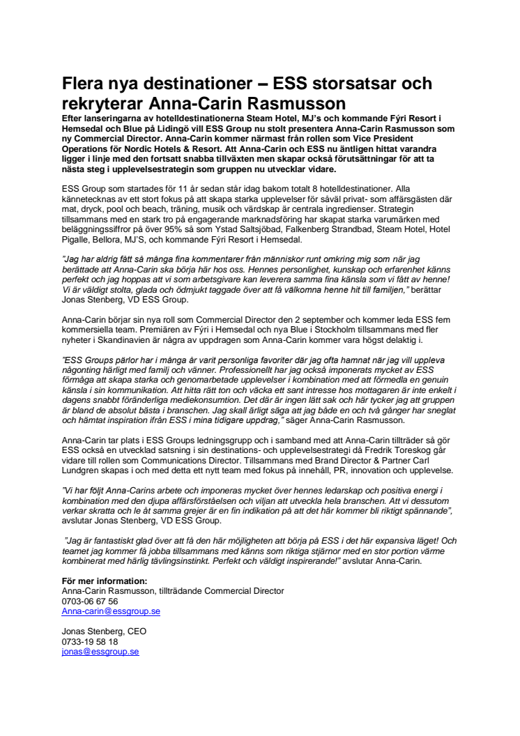 Efter lanseringarna av hotelldestinationerna Steam Hotel, MJ’s och kommande Fýri Resort i Hemsedal och Blue på Lidingö vill ESS Group nu stolt presentera Anna-Carin Rasmusson som ny Commercial Director. Anna-Carin kommer närmast från rollen som Vice President Operations för Nordic Hotels & Resort. Att Anna-Carin och ESS nu äntligen hittat varandra ligger i linje med den fortsatt snabba tillväxten men skapar också förutsättningar för att ta nästa steg i upplevelsestrategin som gruppen nu utvecklar vidare.