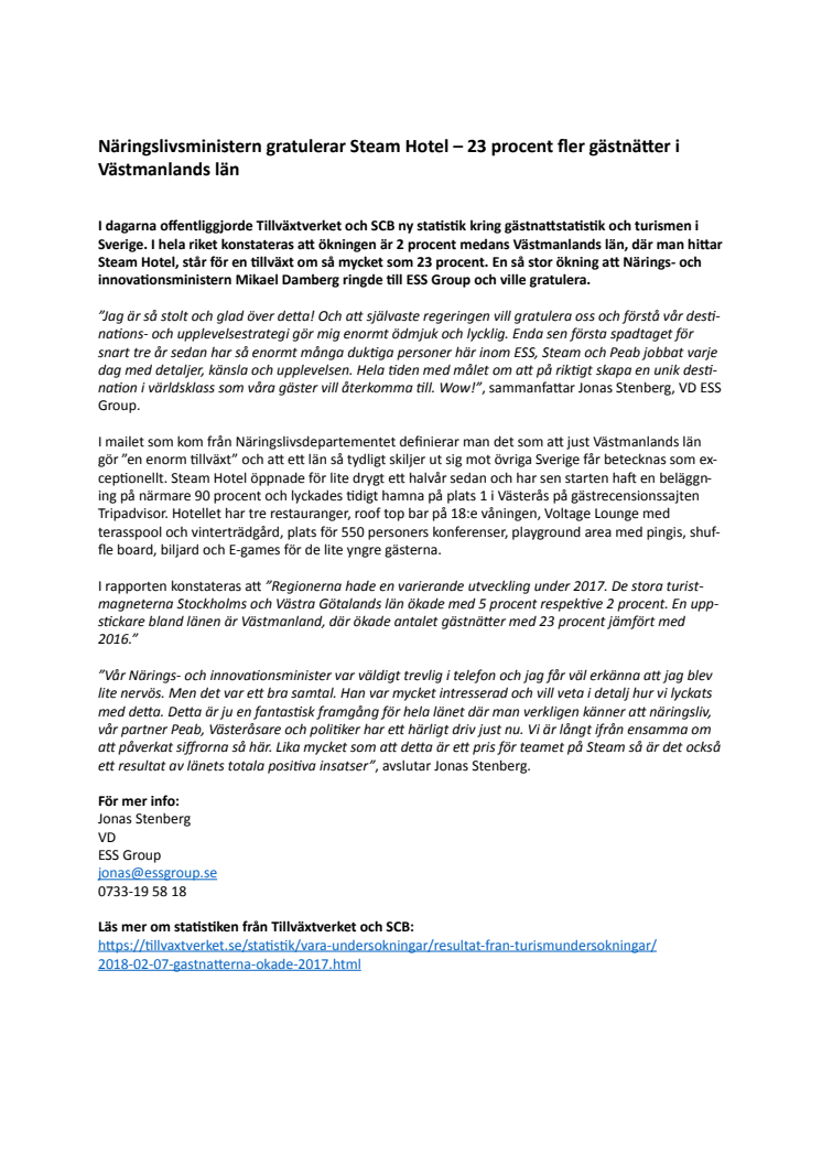 I dagarna offentliggjorde Tillväxtverket och SCB ny statistik kring gästnattstatistik och turismen i Sverige. I hela riket konstateras att ökningen är 2 procent medans Västmanlands län, där man hittar Steam Hotel, står för en tillväxt om så mycket som 23 procent. En så stor ökning att Närings- och innovationsministern Mikael Damberg ringde till ESS Group och ville gratulera.