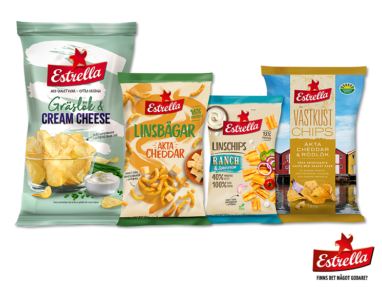 Estrella lanserar flera nyheter v 34, 2018. Linsbågar Äkta Cheddar, Linschips Ranch & SOurcream, Västkustchips Älta Cheddar & Rödlök och potatischipset Gräslök & Cream Cheese.