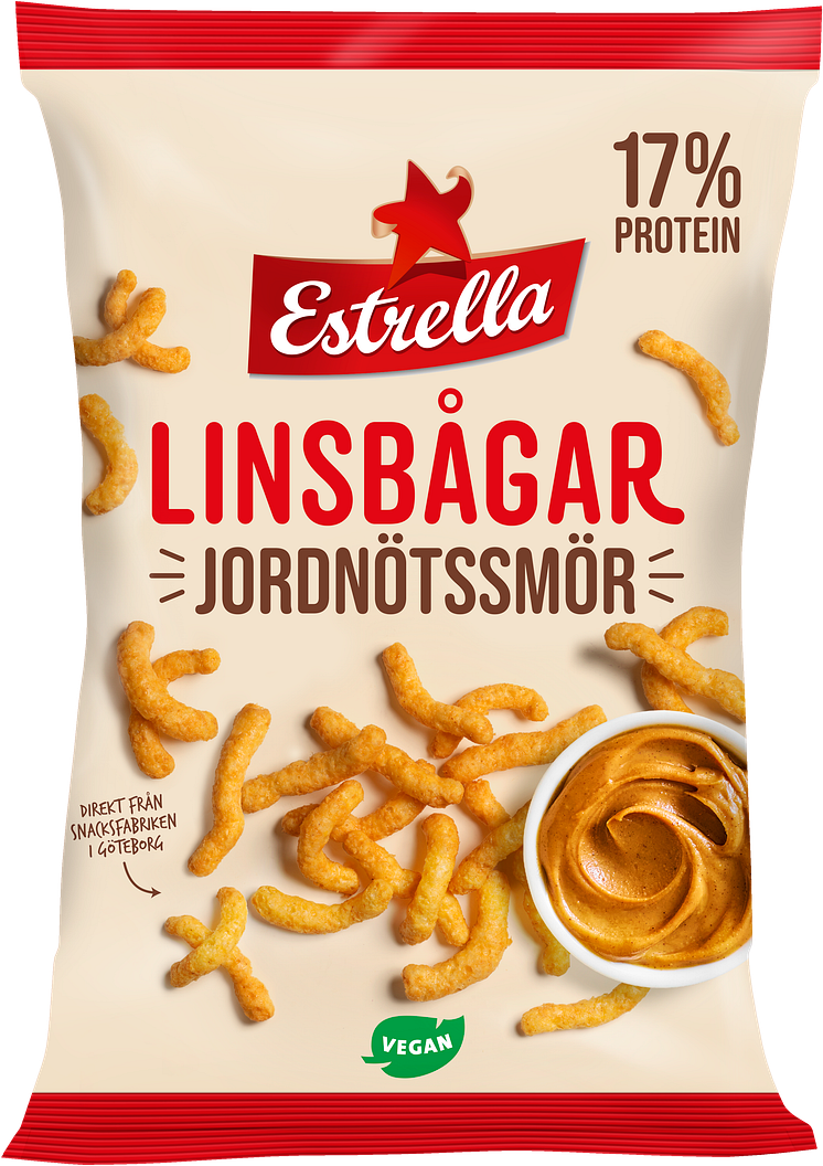 Estrella Linsbågar Jordnötssmör 2021, förlanseras på Coop 14 december 2020. Spröda och krispiga linsbågar med krämigt äkta jordnötssmör.