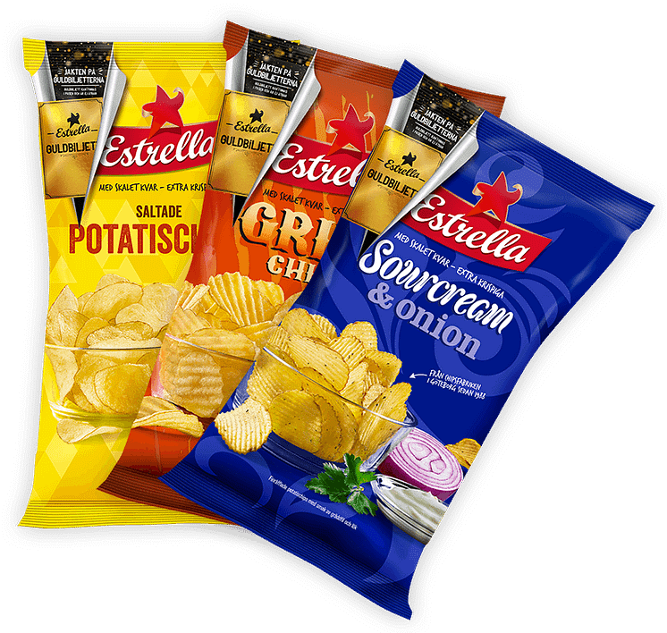 Jakten på guldbiljetterna: kampanj från Estrella 2020. Biljetterna har fördelats mellan smakerna Salt, Grill och Sourcream & Onion