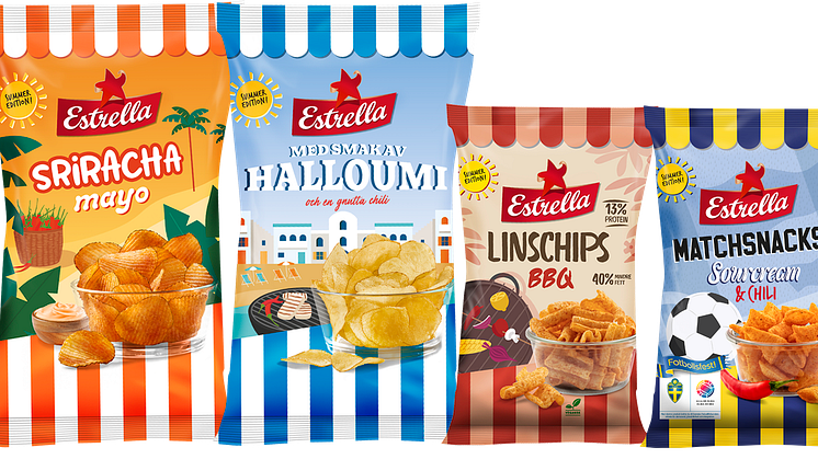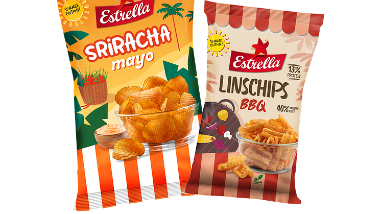 Temperaturerna har äntligen börjat stiga och nu är Estrella redo att presentera hela batteriet av sommarsnacks 2021. Utöver de tidigare presenterade Matchsnacks Sourcream & Chili och Halloumi med en gnutta chili kommer vecka 26 även finräfflade potatischips i smaken Sriracha Mayo och Linschips BBQ!