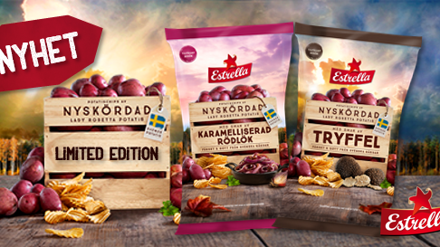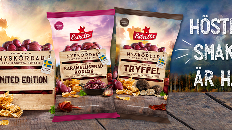 Nyskördad potatis med säsongens smaker, finns det något godare? Estrella lanserar två höstiga chipsnyheter med smakerna ’Tryffel’ och ’Karamelliserad Rödlök’. Vecka 37 landar de tillfälliga smakerna på nyskördad svensk potatis i butik.