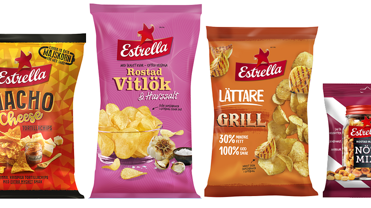 ​Estrella kickar igång 2018 med flera krispiga nyheter! Nu kan vi även presentera chipsnyheten Rostad Vitlök & Havssalt; Lättare chips med smak av Grill och Nötmix Jumbomajs.