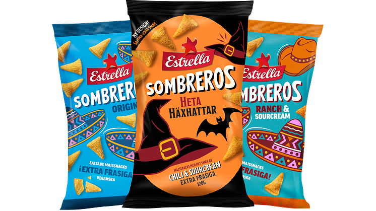 För tredje året hemsöks vi av Estrellas Heta Häxhattar Chili & Sourcream. Spröda halloweensnacks på tillfälligt besök. Basen består av klassiska Sombreros som kryddas med chili och syrlig gräddfil. Lanseras 11 oktober.