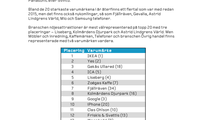 Bland de 20 starkaste varumärkena i år återfinns ett flertal som var med redan 2015, men det finns också nykomlingar, så som Fjällräven, Gevalia, Astrid Lindgrens Värld, Mio och Samsung telefoner.
