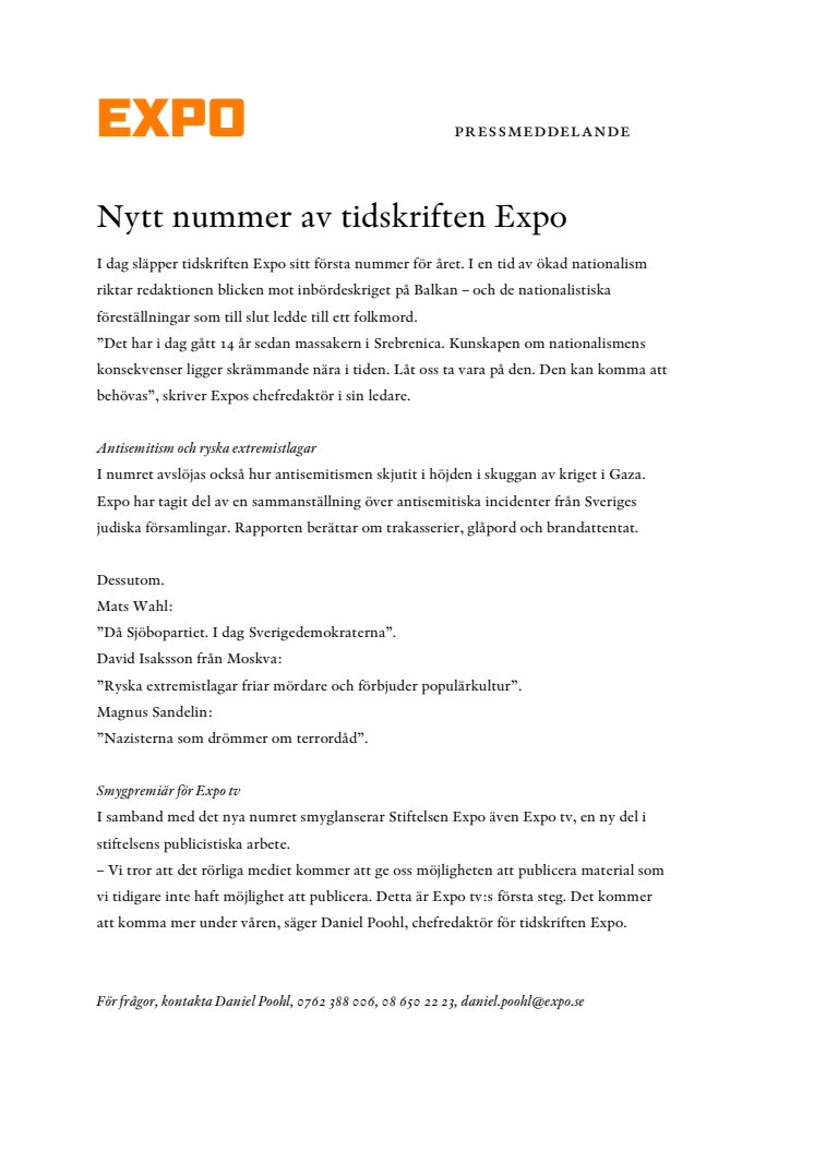 Tidskriften Expo släpper sitt nya nummer. Temat är nationalismens yttersta konsekvenser. Dessutom passar stiftelsen Expo på att smygstarta Expo tv, en ny del i stiftelsens publicistiska arbete.