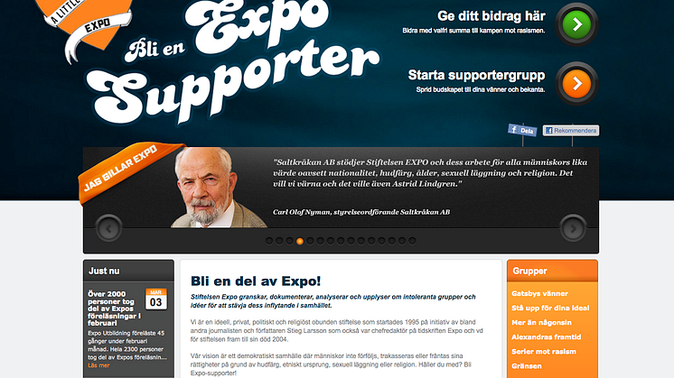 Stiftelsen Expo lanserar en ny fundraising-sajt för ett intensifierat arbete mot den organiserade intoleransen. Vi vill involvera människor som gillar det vi gör och vill att vi gör mer. Ekonomiskt stöd från företag och privatpersoner står för nästan hälften av stiftelsens intäkter. På exposupporter.se kan den som vill skapa sin egen supporter-grupp och bjuda in vänner, kollegor och andra att delta. Vi har packeterat detta på ett kul sätt i skön kontrast till de negativa krafter vi jobbar mot dagligen.