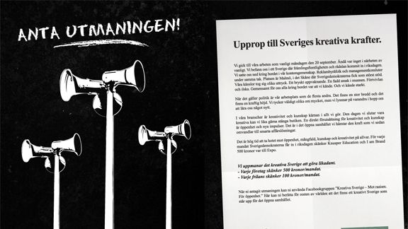 I am brand har tagit initiativ till ett upprop till Sveriges kreativa krafter att stödja Stiftelsen Expo. Tillsammans med Knusper Education uppmanar de nu det kreativa Sverige att stödja Expo. För varje mandat som Sverigedemokraterna får i Riksdagen så skänker företagen 500 kronor var och uppmanar nu branchen att göra likadant. De uppmanar också branchens frilansare att stödja Expo med 100 kronor/mandat.