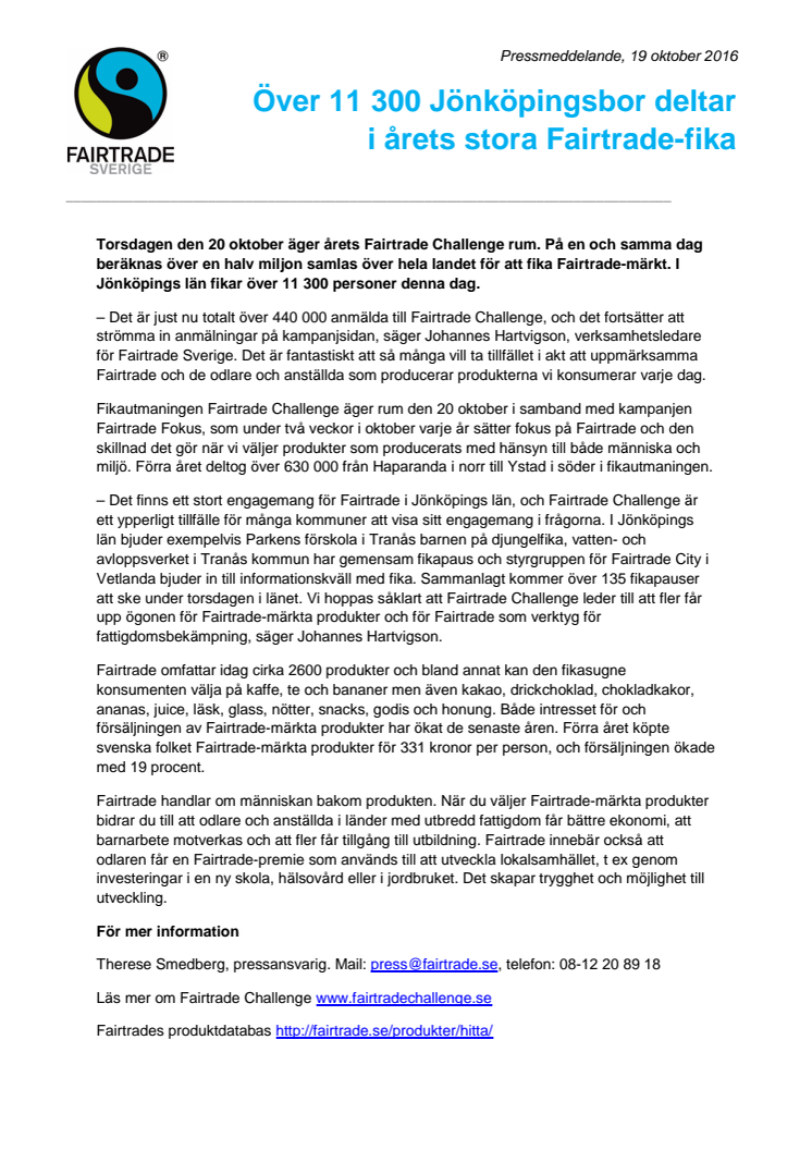 Torsdagen den 20 oktober äger årets Fairtrade Challenge rum. På en och samma dag beräknas över en halv miljon samlas över hela landet för att fika Fairtrade-märkt. I Jönköpings län fikar över 11 300 personer denna dag.