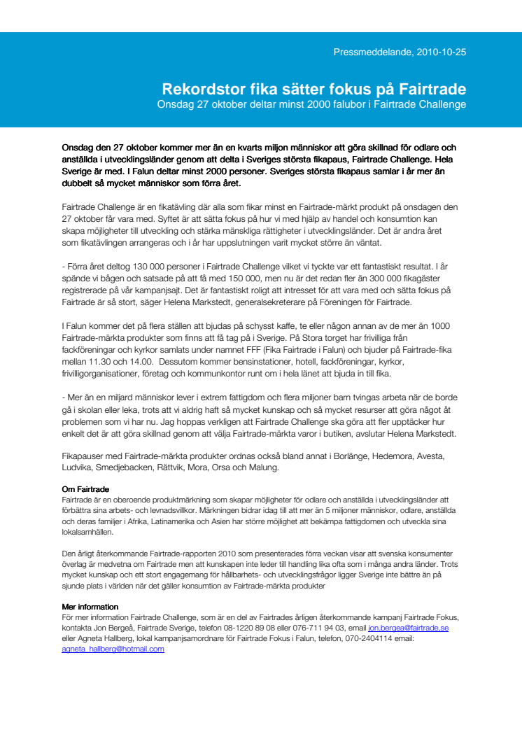 Onsdag den 27 oktober kommer mer än en kvarts miljon människor att göra skillnad för odlare och anställda i utvecklingsländer genom att delta i Sveriges största fikapaus, Fairtrade Challenge. I Stockholm fikar mer än 10 000 personer Fairtrade-märkta produkter. Sveriges största fikapaus samlar i år mer än dubbelt så mycket människor som förra året.