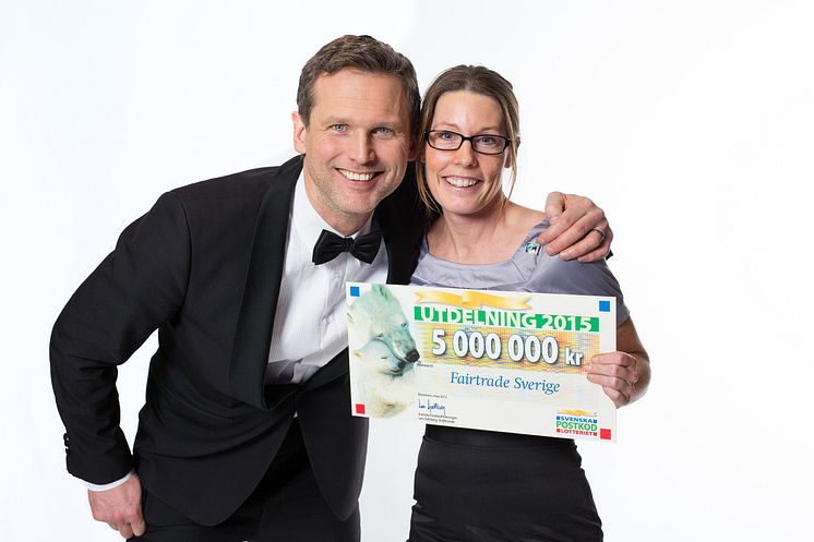 Föreningen för Fairtrade Sveriges generalsekreterare Magdalena Streijffert emottar checken på 5 miljoner kronor från PostkodLotteriets Rickard Sjöberg.