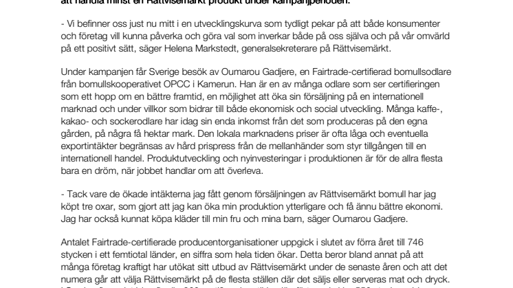 Under kampanjen får Sverige besök av Oumarou Gadjere, en Fairtrade-certifierad bomullsodlare från bomullskooperativet OPCC i Kamerun. Han är en av många odlare som ser certifieringen som ett hopp om en bättre framtid, en möjlighet att öka sin försäljning på en internationell marknad och under villkor som bidrar till både ekonomisk och social utveckling. Många kaffe-, kakao- och sockerodlare har idag sin enda inkomst från det som produceras på den egna gården, på några få hektar mark. Den lokala marknadens priser är ofta låga och eventuella exportintäkter begränsas av hård prispress från de mellanhänder som styr tillgången till en internationell handel. Produktutveckling och nyinvesteringar i produktionen är för de allra flesta bara en dröm, när jobbet handlar om att överleva.