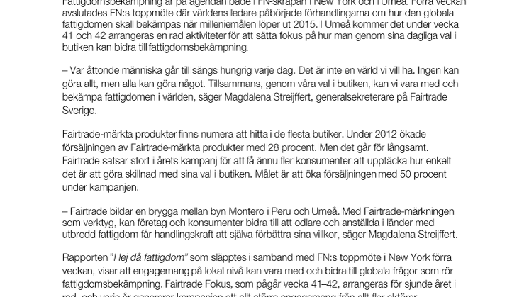Rapporten ”Hej då fattigdom” som släpptes i samband med FN:s toppmöte i New York förra veckan, visar att engagemang på lokal nivå kan vara med och bidra till globala frågor som rör fattigdomsbekämpning. Fairtrade Fokus, som pågår vecka 41–42, arrangeras för sjunde året i rad, och varje år genererar kampanjen ett allt större engagemang från allt fler aktörer. Konsumenten kommer att få möta Fairtrade i allt från rikstäckande utomhusreklam till hundratals aktiviteter på stan runt om i landet. Dagligvaruhandeln kommer att delta genom skyltning, butiksprovningar och fikapauser i över 2000 butiker. Dessutom förväntas hundratusentals personer delta i Fairtrade Challenge – årets stora Fairtrade-fika den 17 oktober. Målet är att slå förra årets rekord då över 600 000 deltagare fikade Fairtrade under en och samma dag.