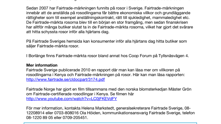 För mer information, kontakta Helena Markstedt, generalsekreterare Fairtrade Sverige, 08-12208914 eller 0703-808016 Ola Höiden, kommunikationsansvarig Fairtrade Sverige, telefon 08-1220 89 05 eller 0709-205451.