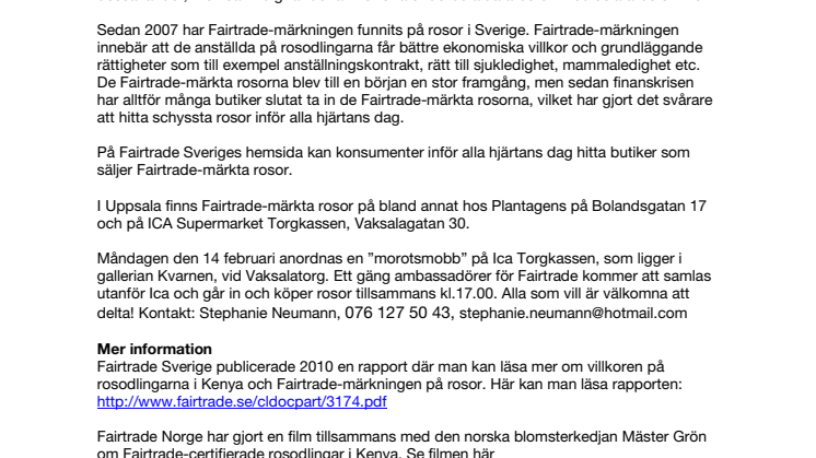 Måndagen den 14 februari anordnas en ”morotsmobb” på Ica Torgkassen, som ligger i gallerian Kvarnen, vid Vaksalatorg. Ett gäng ambassadörer för Fairtrade kommer att samlas utanför Ica och går in och köper rosor tillsammans kl.17.00. Alla som vill är välkomna att delta! Kontakt: Stephanie Neumann, 076 127 50 43, stephanie.neumann@hotmail.com