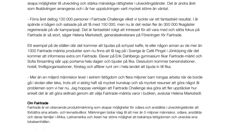 - Förra året deltog 130 000 personer i Fairtrade Challenge vilket vi tyckte var ett fantastiskt resultat. I år spände vi bågen och satsade på att få med 150 000, men nu är det redan fler än 300 000 fikagäster registrerade på vår kampanjsajt. Det är fantastiskt roligt att intresset för att vara med och sätta fokus på Fairtrade är så stort, säger Helena Markstedt, generalsekreterare på Föreningen för Fairtrade.