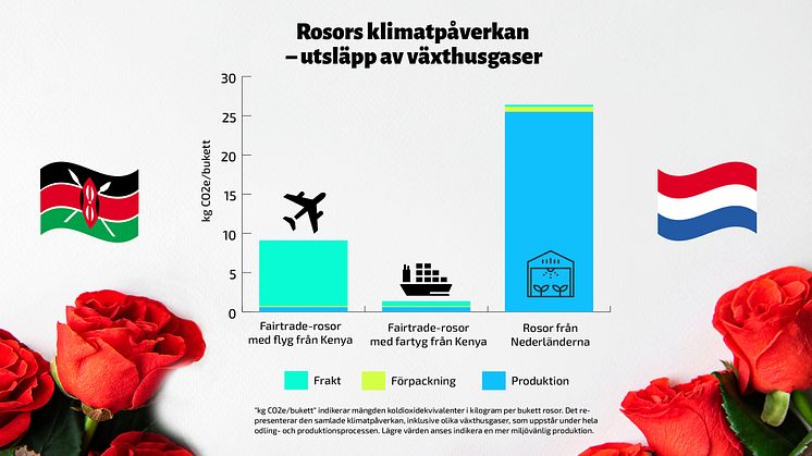 Klimatavtrycket från nederländska rosor är särskilt stort när det gäller utsläpp av växthusgaser och energianvändning*. Nederländska rosor genererar 2,9 gånger mer utsläpp av växthusgaser än kenyanska Fairtrade-rosor, även om de flygs till Europa. Jämfört med kenyanska rosor som fraktas med båt är utsläppen från de holländska rosorna 21 gånger högre.
