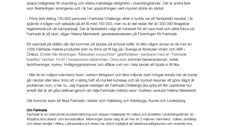 - Förra året deltog 130 000 personer i Fairtrade Challenge vilket vi tyckte var ett fantastiskt resultat. I år spände vi bågen och satsade på att få med 150 000, men nu är det redan fler än 300 000 fikagäster registrerade på vår kampanjsajt. Det är fantastiskt roligt att intresset för att vara med och sätta fokus på Fairtrade är så stort, säger Helena Markstedt, generalsekreterare på Föreningen för Fairtrade.