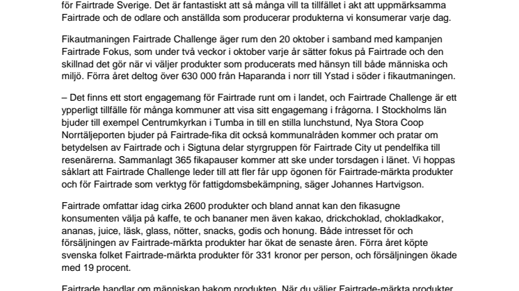 – Det finns ett stort engagemang för Fairtrade runt om i landet, och Fairtrade Challenge är ett ypperligt tillfälle för många kommuner att visa sitt engagemang i frågorna. I Stockholms län bjuder till exempel Centrumkyrkan i Tumba in till en stilla lunchstund, Nya Stora Coop Norrtäljeporten bjuder på Fairtrade-fika dit också kommunalråden kommer och pratar om betydelsen av Fairtrade och i Sigtuna delar styrgruppen för Fairtrade City ut pendelfika till resenärerna. Sammanlagt 365 fikapauser kommer att ske under torsdagen i länet. Vi hoppas såklart att Fairtrade Challenge leder till att fler får upp ögonen för Fairtrade-märkta produkter och för Fairtrade som verktyg för fattigdomsbekämpning, säger Johannes Hartvigson.