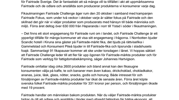 Torsdagen den 20 oktober äger årets Fairtrade Challenge rum. På en och samma dag beräknas över en halv miljon samlas över hela landet för att fika Fairtrade-märkt. I Norrbotten fikar över 12 800 personer denna dag.
