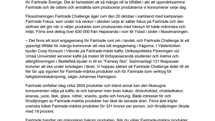 – Det finns ett stort engagemang för Fairtrade runt om i landet, och Fairtrade Challenge är ett ypperligt tillfälle för många kommuner att visa sitt engagemang i frågorna. I Västerbotten bjuder Coop Konsum i Vännäs på Fairtrade-märkt kaffe,Utrikespolitiska Föreningen vid Umeå Universitet serverar kaffe på maten till förbipasserande studenter och Astma och allergiföreningen i Skellefteå bjuder in till en ”Fairway fika”. Sammanlagt 121 fikapauser kommer att ske under torsdagen i länet. Vi hoppas såklart att Fairtrade Challenge leder till att fler får upp ögonen för Fairtrade-märkta produkter och för Fairtrade som verktyg för fattigdomsbekämpning, säger Johannes Hartvigson.