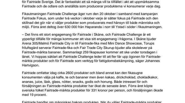 – Det finns ett stort engagemang för Fairtrade i Skåne, och Fairtrade Challenge är ett ypperligt tillfälle för många kommuner att visa sitt engagemang i frågorna. I Skåne bjuder Arena 305/Malmö Fairtrade City in till Fairtrade-fika med Mini Dance Showcase, Torups friluftsgård serverar Fairtrade-fika och Fair Trade City Skurup bjuder alla skolelever på Fairtrade-märkta bananer. Sammanlagt 259 fikapauser kommer att ske under torsdagen i länet. Vi hoppas såklart att Fairtrade Challenge leder till att fler får upp ögonen för Fairtrade-märkta produkter och för Fairtrade som verktyg för fattigdomsbekämpning, säger Johannes Hartvigson.