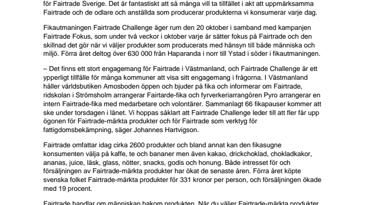 – Det finns ett stort engagemang för Fairtrade i Västmanland, och Fairtrade Challenge är ett ypperligt tillfälle för många kommuner att visa sitt engagemang i frågorna. I Västmanland håller världsbutiken Amosboden öppen och bjuder på fika och informerar om Fairtrade, ridskolan i Strömsholm arrangerar Fairtarde-fika och fyrverkeriarrangören Pyro arrangerar en intern Fairtrade-fika med medarbetare och volontärer. Sammanlagt 66 fikapauser kommer att ske under torsdagen i länet. Vi hoppas såklart att Fairtrade Challenge leder till att fler får upp ögonen för Fairtrade-märkta produkter och för Fairtrade som verktyg för fattigdomsbekämpning, säger Johannes Hartvigson.