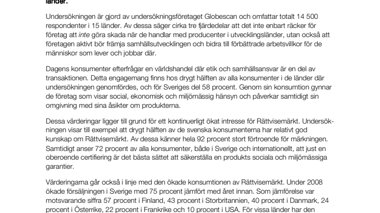 Intresset för Rättvisemärkt och Fairtrade internationellt fortsätter växa, trots den globala lågkonjunkturen. Det bekräftas dels av försäljningsökningen under 2008, dels i resultatet av en omfattande internationell undersökning som visar att dagens konsumenter har höga förväntningar på att företag agerar ansvarsfullt vid handel med producenter i utvecklingsländer.