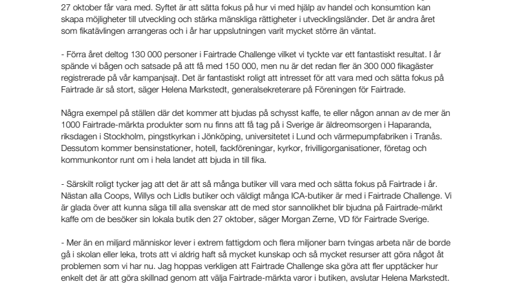 Onsdag den 27 oktober kommer mer än en kvarts miljon människor att göra skillnad för odlare och anställda i utvecklingsländer genom att delta i Sveriges största fikapaus, Fairtrade Challenge. Hela Sverige är med. Från Haparanda i norr till Trelleborg i söder bjuds det på fika med Fairtrade-märkta produkter. Sveriges största fikapaus samlar i år mer än dubbelt så mycket människor som förra året.