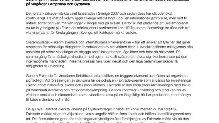 Under 2010 ökade försäljningen av Fairtrade-märkta viner med nio procent på den svenska marknaden, till ett värde av totalt 153 miljoner kronor. Nu lanseras ytterligare sju Fairtrade-märkta viner på Systembolaget och konsumenten får därmed ett ännu större urval av välja bland. Satsningen innebär också förbättrade arbets- och levnadsvillkor för ännu fler odlare och anställda på vingårdar i Argentina och Sydafrika.