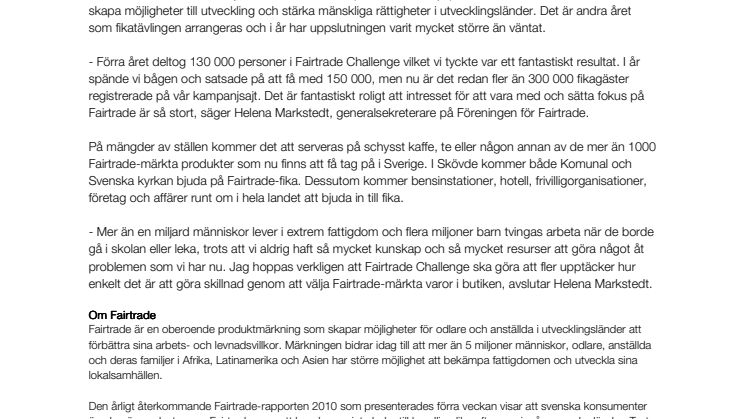 - Förra året deltog 130 000 personer i Fairtrade Challenge vilket vi tyckte var ett fantastiskt resultat. I år spände vi bågen och satsade på att få med 150 000, men nu är det redan fler än 300 000 fikagäster registrerade på vår kampanjsajt. Det är fantastiskt roligt att intresset för att vara med och sätta fokus på Fairtrade är så stort, säger Helena Markstedt, generalsekreterare på Föreningen för Fairtrade.